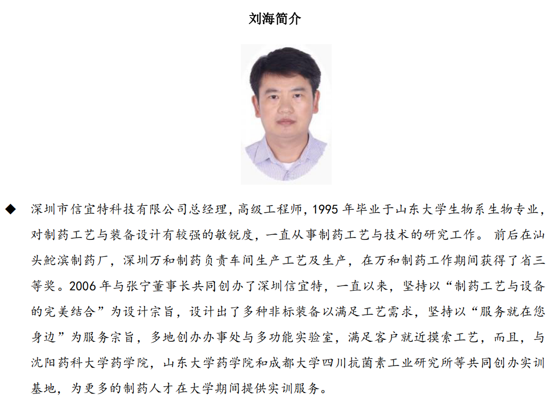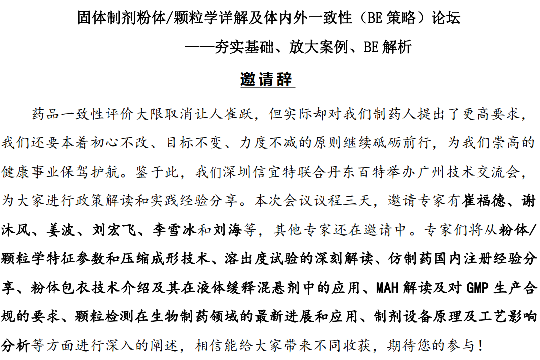 藥品一致性評價大限取消讓人雀躍,但實際卻對我們制藥人提出了更高要求, 我們還要本著初心不改、目 標不變、力度不減的原則繼續砥礪前行,為我們崇高的 健康事業保駕護航。鑒于此,我們深圳信宜特聯合丹東百特舉辦廣州技術交流會, 為大家進行政策解讀和實踐經驗分享。本次會議議程三天,邀請專家有崔福德、謝 沐風、姜波、劉宏飛、李雪冰和劉海等,其他專家還在邀請中。專家們將從粉體/ 顆粒學特征參數和壓縮成形技術、溶出度試驗的深刻解讀、仿制藥國內注冊經驗分 享、粉體包衣技術介紹及其在液體緩釋混懸劑中的應用、MAH 解讀及對GMP生產合 規的要求、顆粒檢測在生物制藥領域的最新進展和應用、制劑設備原理及工藝影響 分析等方面進行深入的闡述,相信能給大家帶來不同收獲,期待您的參與!